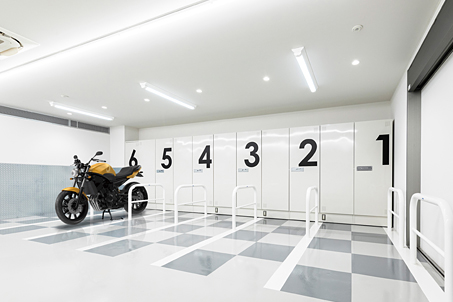 自分専用のバイクルームとして使えるガレージタイプと安心のセキュリティで空調完備のオープンタイプ。ツーリングに必要な装備品をまとめて収納できる無料のロッカーおよび棚も完備しております。